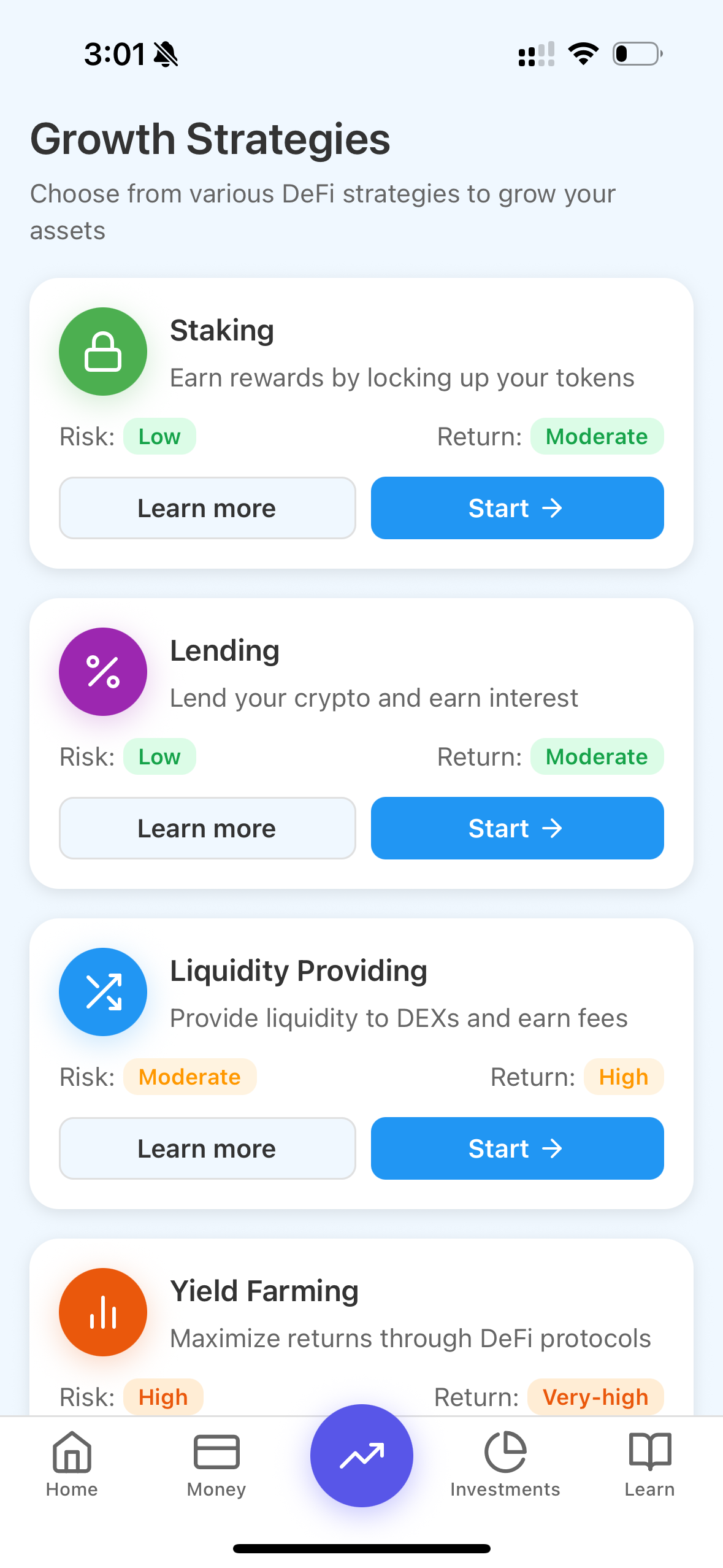 Why it matters: Instead of guessing what each strategy means, you can click "Learn More" to understand or "Start" to begin in a few taps.