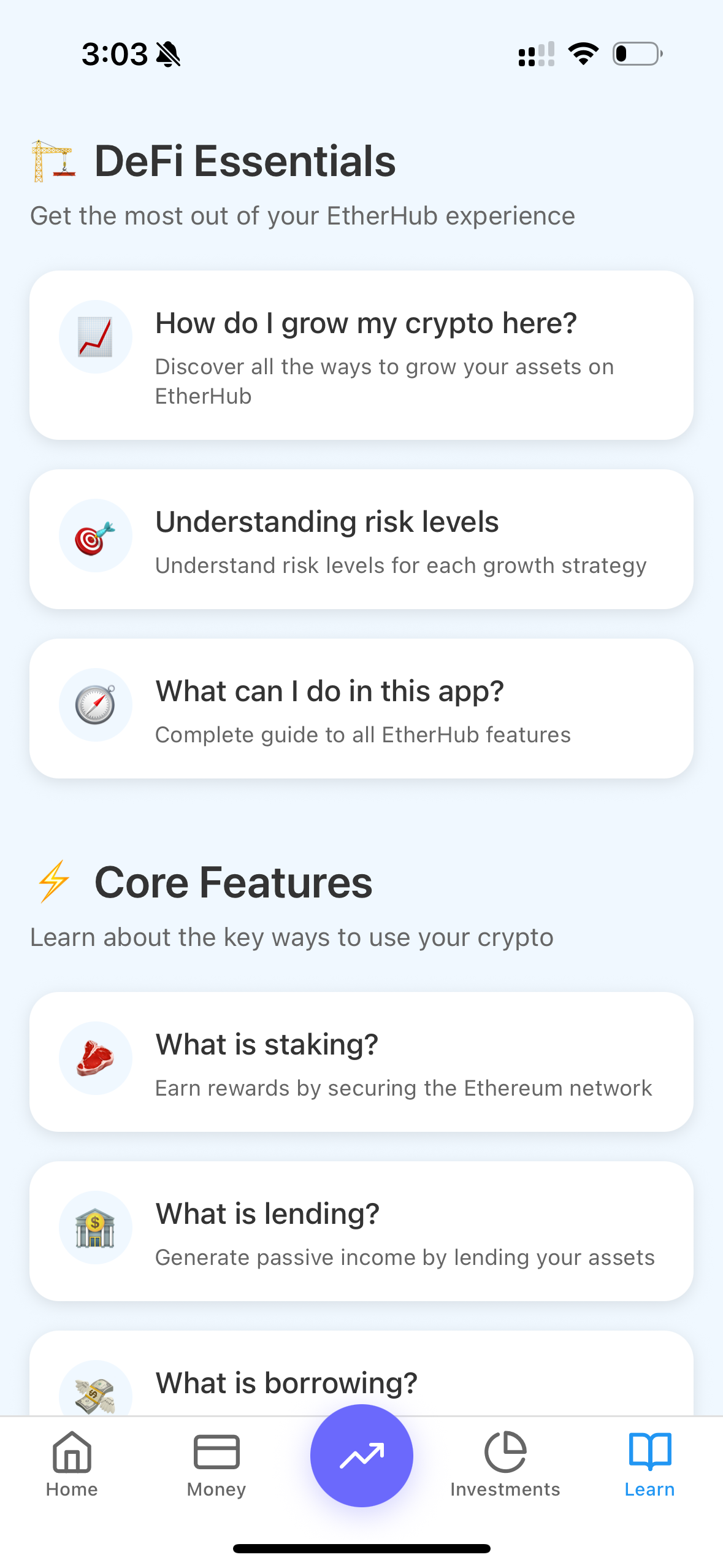 - "What is staking? What is lending?" → Short, simple explanations tied directly to EtherHub features